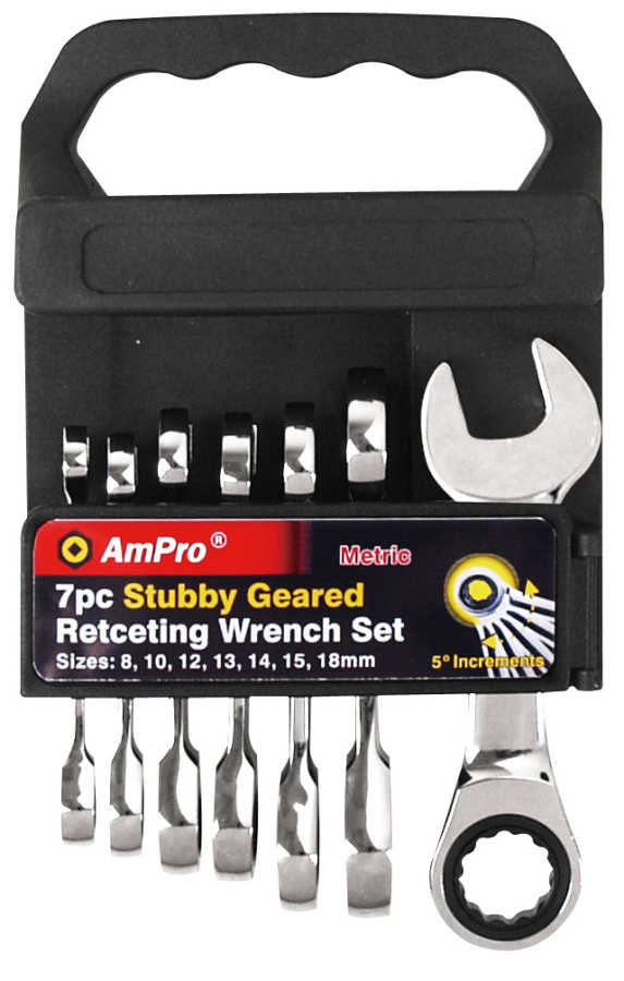 Приобрести T41383 Набор ключей комбинированных трещеточных укороченных ,7 предметов (8-19мм) от компании AmPro (Тайвань) из раздела Наборы ключей по цене 3 252 рублей.