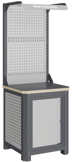 Состоит из столешницы шириной 693 мм, рамы верстака, состоящей из опор, перемычек, боковых перфопанелей, малого модуля S7, двойного экрана с кронштейнами и комплекта освещения.