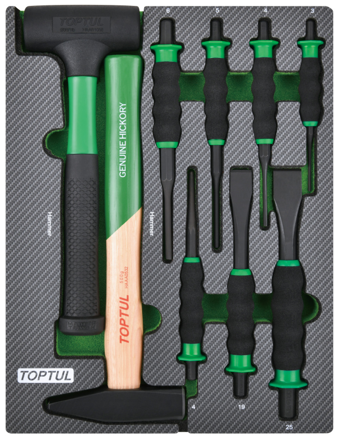 Набор инструментов, молоток, выколотки и зубила 9 пр. в мягком ложементе TOPTUL